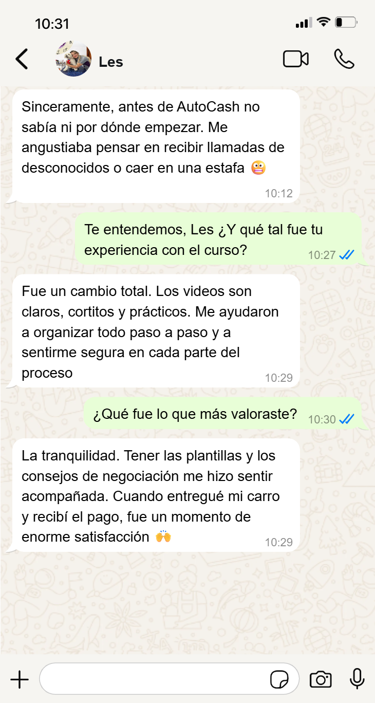 Sabemos que el valor real de este curso es mucho mayor. Sin embargo, decidimos ponerlo al alcance de cualquiera que esté a punto de vender su auto. No porque valga poco, sino porque queremos que tengas la oportunidad de aplicarlo de inmediato y comprobar por ti mismo lo que puedes lograr.
