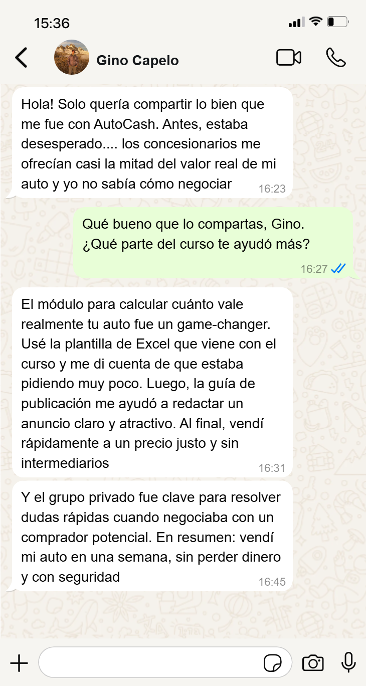No es un curso inventado ni basado en teoría. Durante casi tres décadas he estado en el negocio automotor, viendo cómo la gente pierde dinero al vender su auto y aplicando las mismas estrategias que ahora te enseño.
